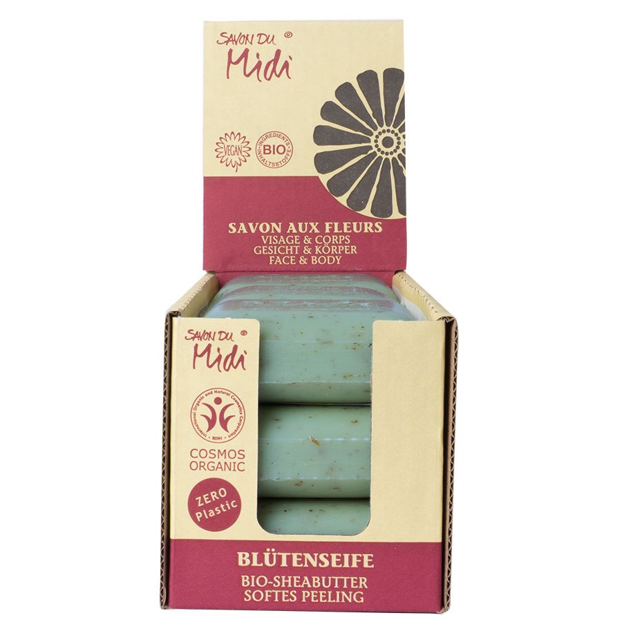 Die BIO Blüten-Seifen von Savon du Midi werden in der Provence in Frankreich hergestellt. Die Seifenherstellung aus Pflanzenölen hat rund um das Mittelmeer eine lange Tradition. Ihre Schwerpunkte im Süden Frankreichs sind Marseille und die Provence. Für die Herstellung der Seife werden im Verseifungsprozeß ausschließlich pflanzliche Öle aus kontrolliert biologischem Anbau (kbA) verwendet. Nach der Verseifung werden bei der endgültigen Verarbeitung Bio-Sheabutter, feine Blütenteile und hochwertige Parfume oder ätherisches Öl zugegeben. Savon du Midi Seifen werden mit dem überlieferten Fachwissen in der Tradition der provencalischen Seifenherstellung gefertigt. Diese vorwiegend handwerkliche Produktionsweise findet sich in der Qualität einer milden und pflegenden Seife wieder.